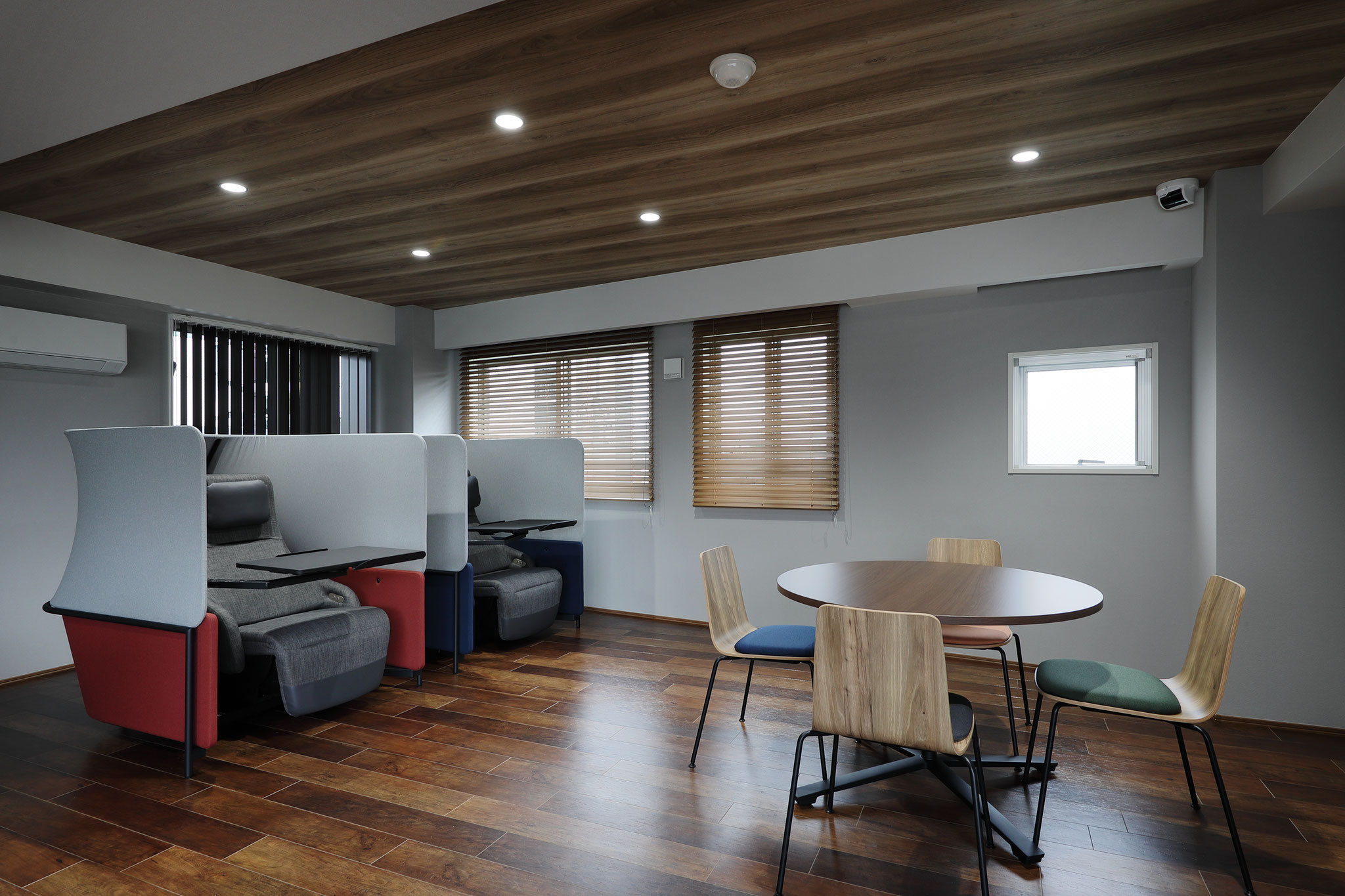 - キッチン設備、カウンター、大型デスク、一人用ワークブースを配置し、業務だけでなく休憩やカジュアルな交流もできるスペースに。