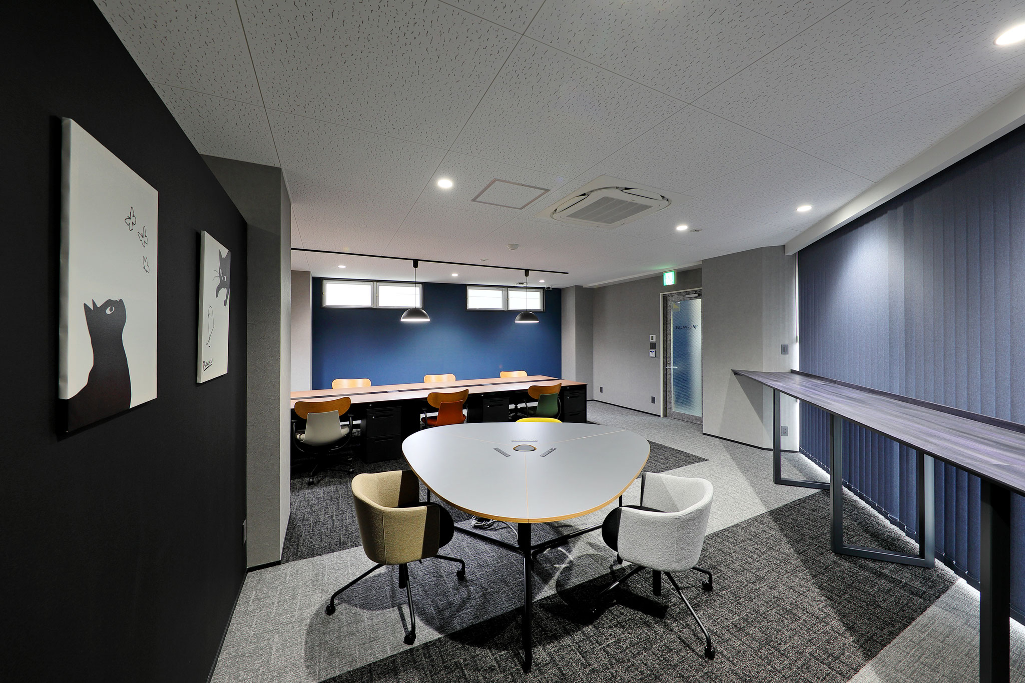 - 昇降デスク、小デスク、大デスクと、異なるタイプのデスクを配置した3つの個室を設けることで、多様な働き方に対応。